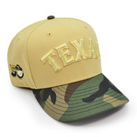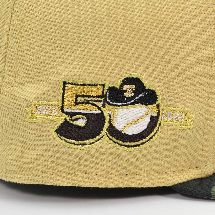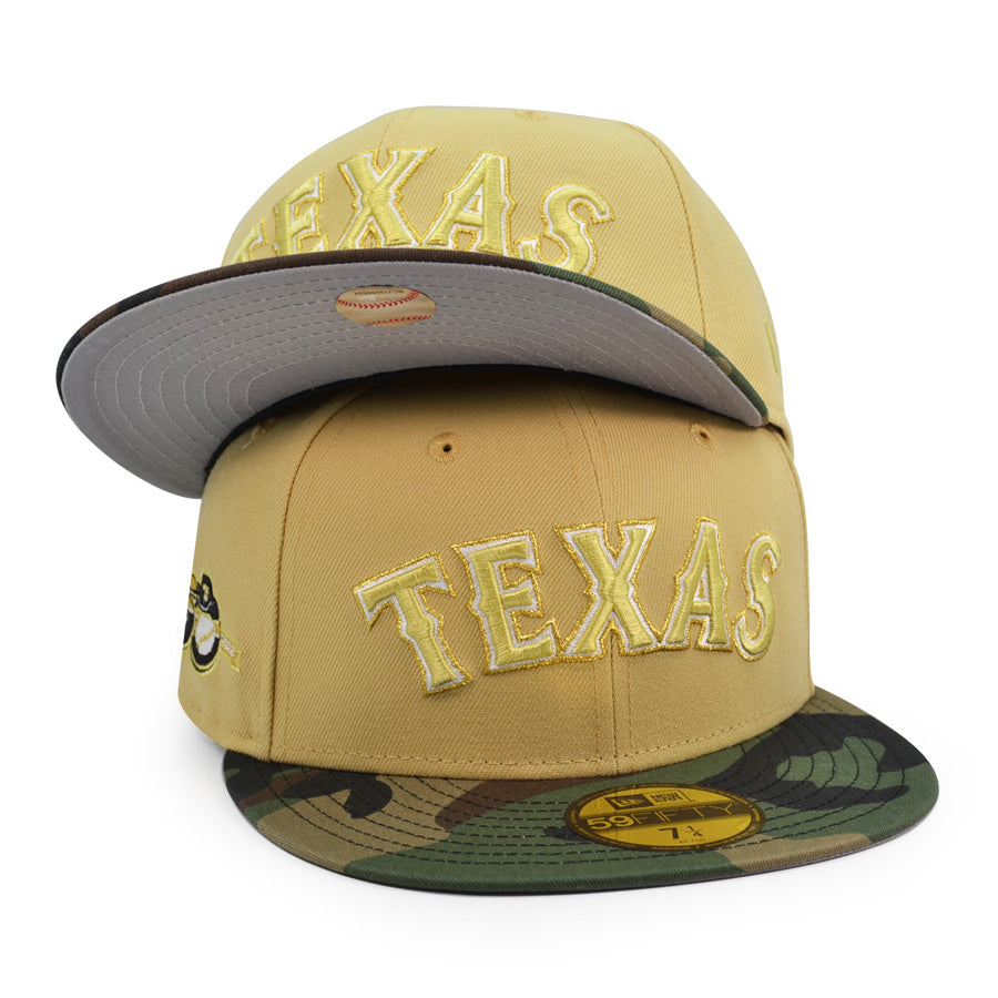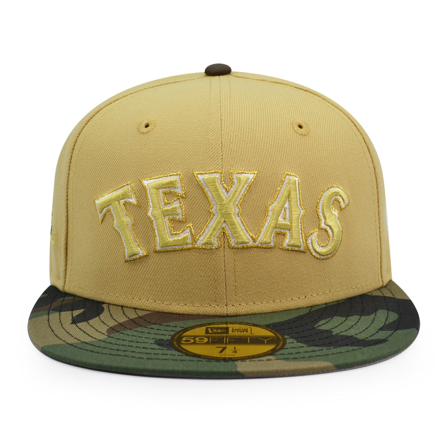 Texas Rangers 50th ANNIVERSARY Exclusive New Era 59Fifty Fitted Hat - Vegas Gold/Woodland Camo