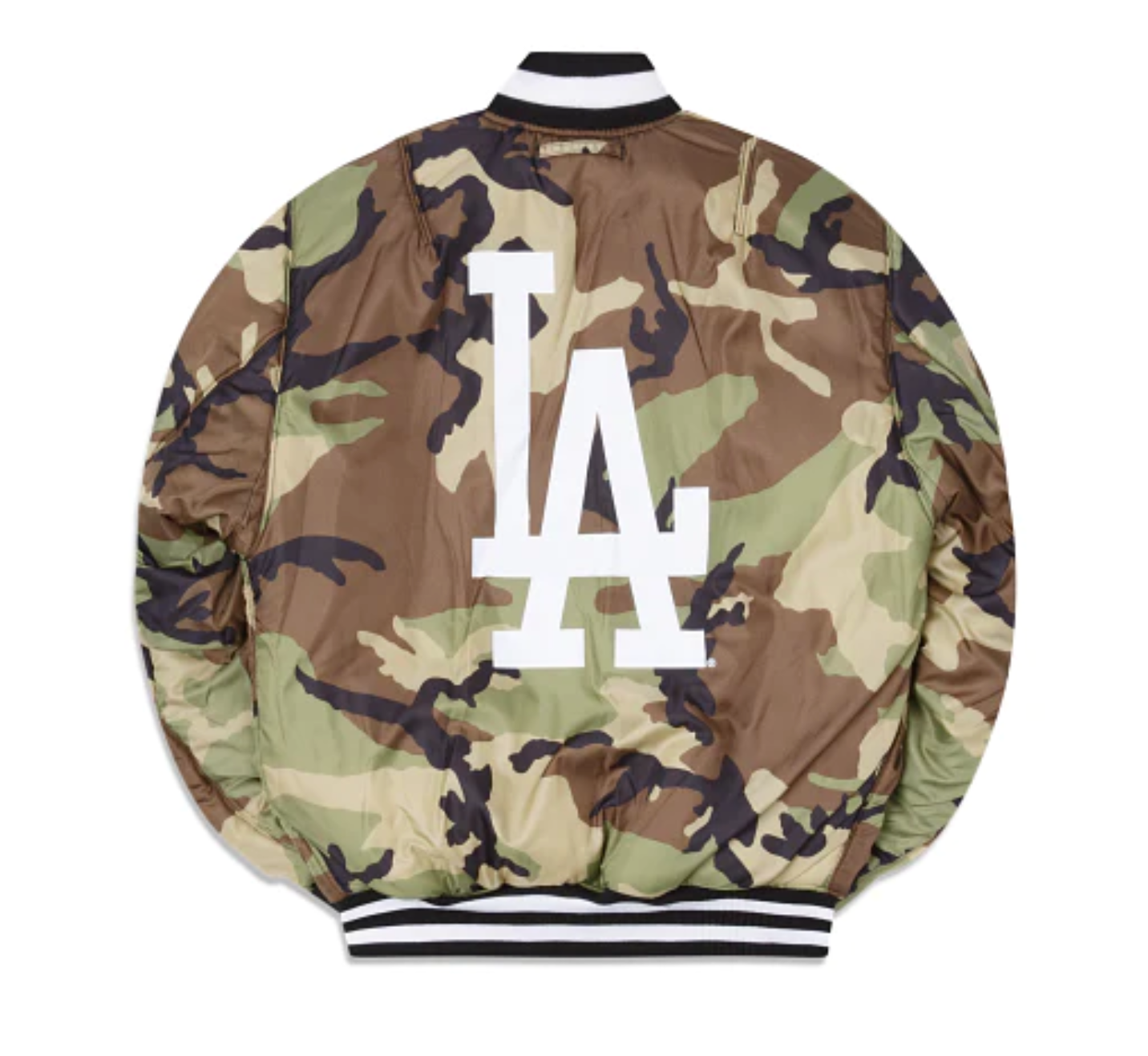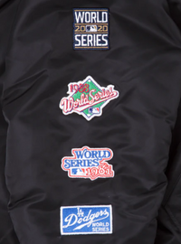 The Alpha Industries X Los Angeles Dodgers MA-1 Bomber Jacket features embroidered team patches throughout the chest and sleeves with an embroidered applique team wordmark at the rear. Additional details include a utility pocket with the Alpha Industries ribbon at the right-wear sleeve. The reversible jacket features a camo fabrication at the interior with a multi-lingual message at the left chest and a screen-printed team logo at the rear.