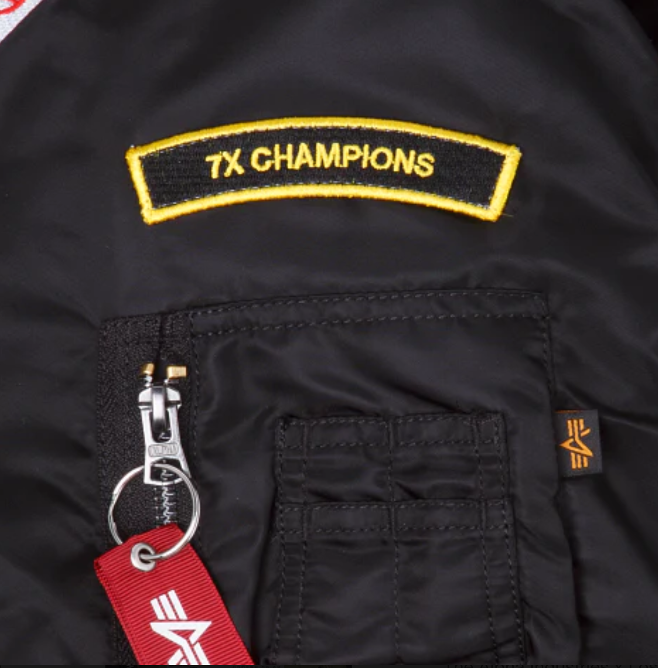 - Alpha Industries red ribbon on utility pocket
