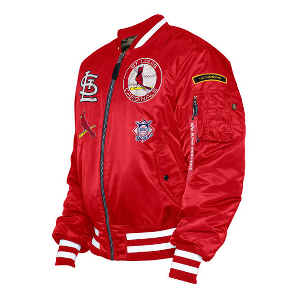 The Alpha Industries X St.Louis Cardinals MA-1 Bomber Jacket features embroidered team patches throughout the chest and sleeves with an embroidered applique team wordmark at the rear. Additional details include a utility pocket with the Alpha Industries ribbon at the right-wear sleeve. The reversible jacket features a camo fabrication at the interior with a multi-lingual message at the left chest and a screen-printed team logo at the rear.